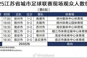 体育资讯07月06日讯 江苏省城市足球联赛第六轮战罢,德转朱艺统计了本轮“苏超”场均观赛人数以及总人数。值得一提的是,第六轮总计超20万人现场观赛,场均人数为33871,再次刷新了纪录。